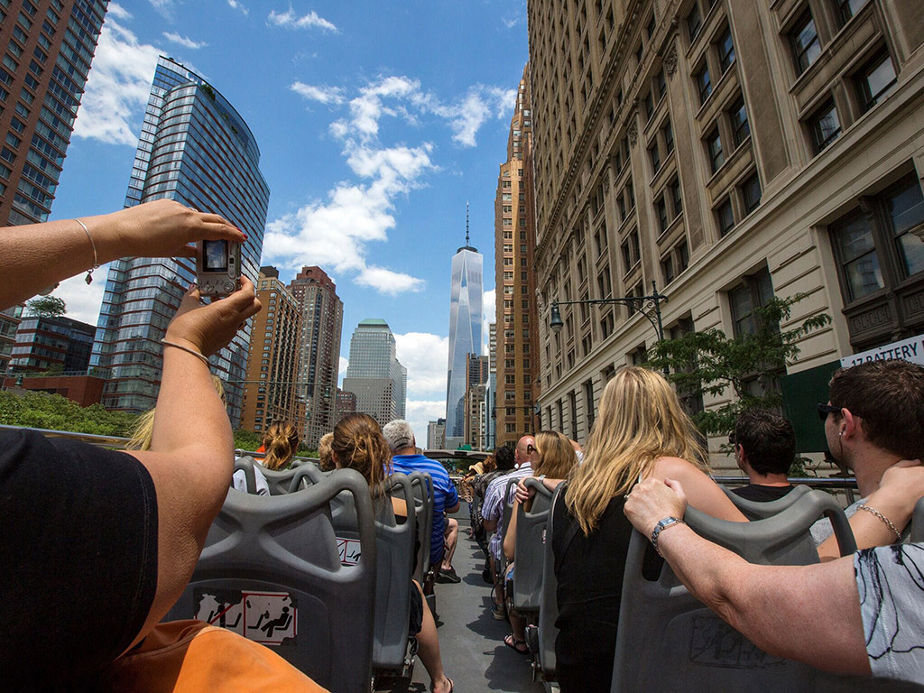 Get to the beating heart of NYC on our Downtown Loop (Red Route) You'll be right in the midst of it as you travel through iconic areas like Times Square, 5th Avenue, Broadway and Wall Street. Look up to see the city's famous skyscrapers, and enjoy fantastic views of the Statue of Liberty and Ellis Island from the Westside Highway.