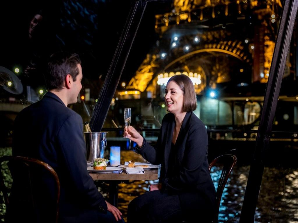 Admire a magnificent view of the illuminated monuments along the Seine and the bridges of Paris that lie across it. From the boat's large bay windows, you will see the Musée d'Orsay, Notre-Dame de Paris Cathedral, and the Conciergerie located on the Ile de la Cité, as well as the Louvre. This exceptional view will also include a chance to observe the illuminated Eiffel Tower as the boat passes by. In the boat's cozy and intimate surroundings, enjoy a romantic or relaxed dinner in a warm atmosphere. You will spend an enchanted evening savouring a traditional French meal prepared with seasonal produce.