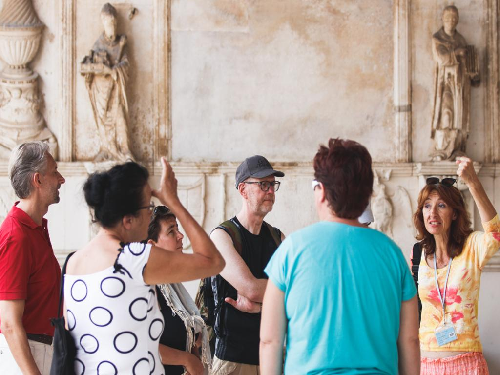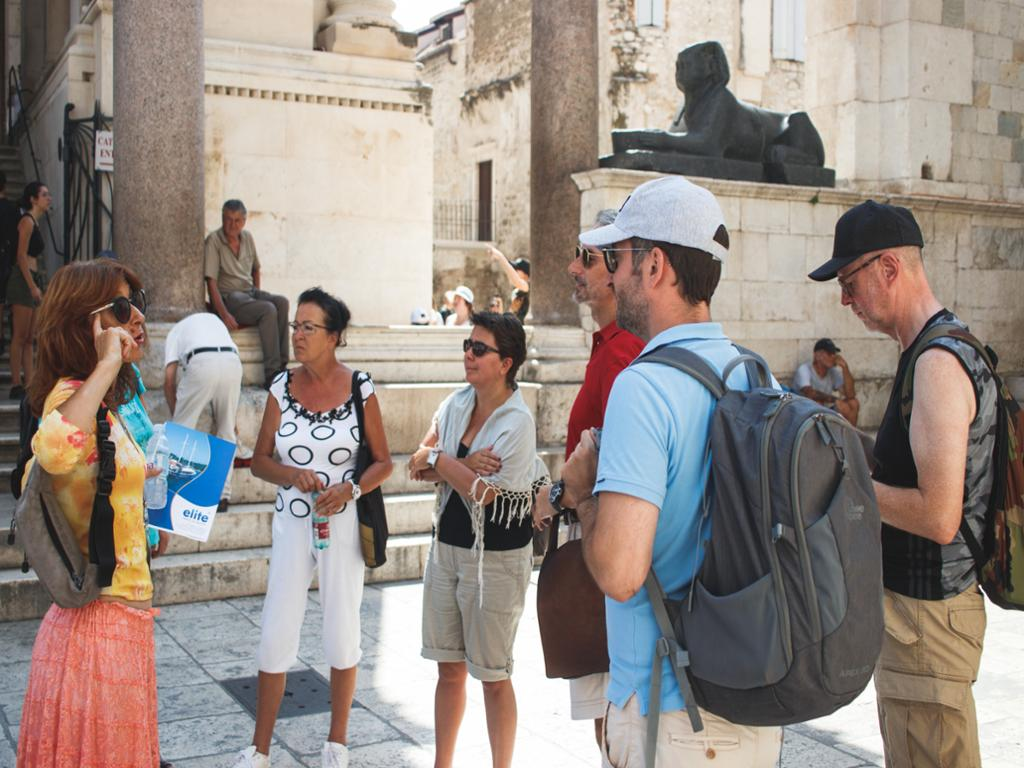 Split is situated on a peninsula and surrounded by historical towns and settlements. We shall take a walk through the 4th-century Diocletian's Palace and its ancient Cellars, the Peristyle, Roman temples (today Christian ones) – the Cathedral and the Baptistery, and then the famous Golden Gate. After a sightseeing tour of the town of Split and some free time for individual exploring, we start our bus ride towards Trogir.