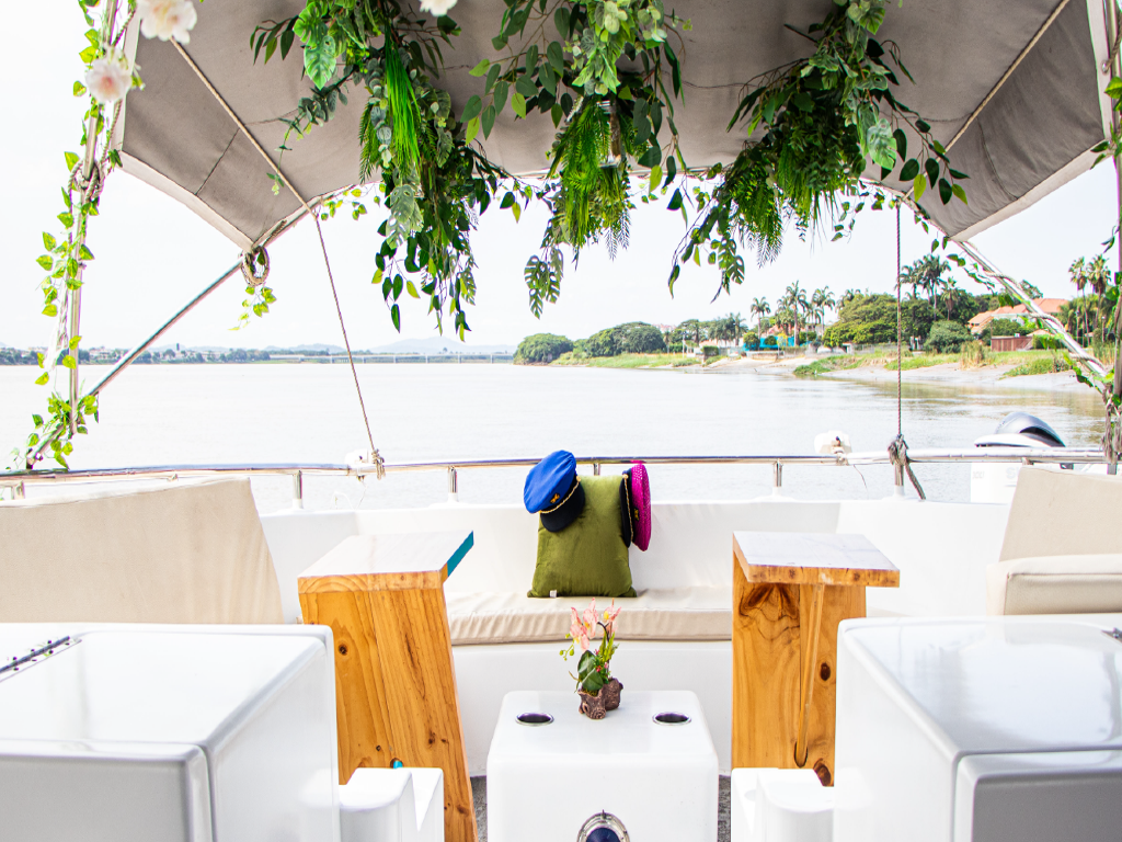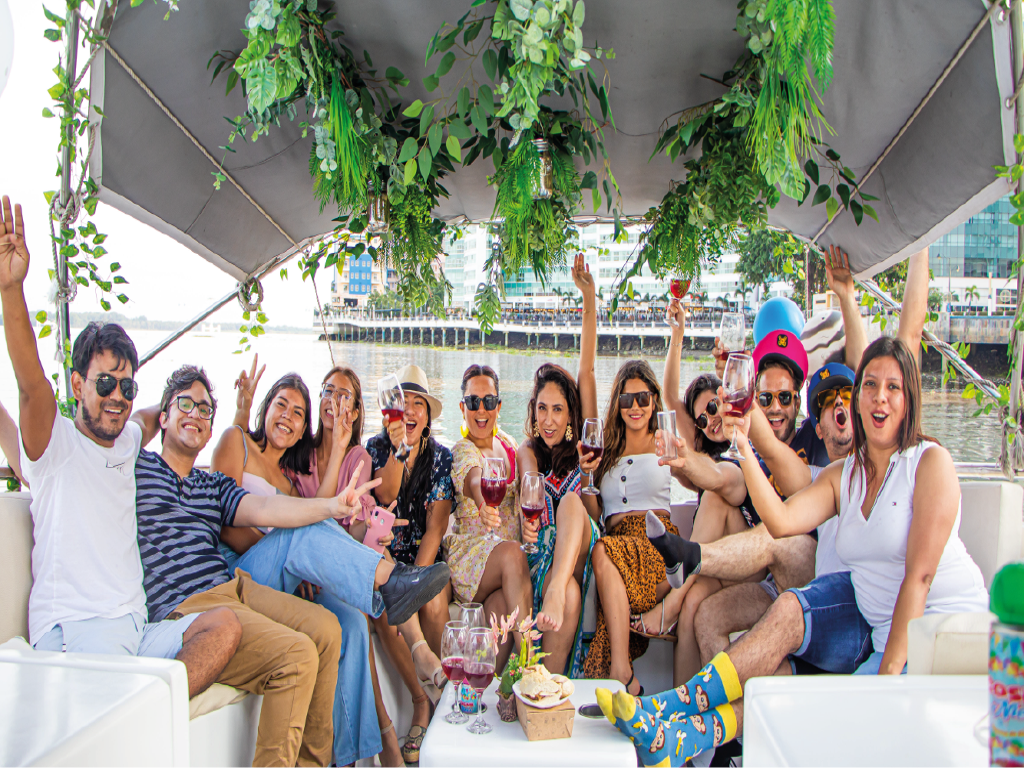 With everything ready, the catamaran departs from the Historical Park and begins sailing along the majestic Guayas River. At the very start of the journey, passengers enjoy a breathtaking panoramic view of Guayaquil, where the modern neighborhood of Puerto Santa Ana stands out, framed by the historic Santa Ana Hill in the background.