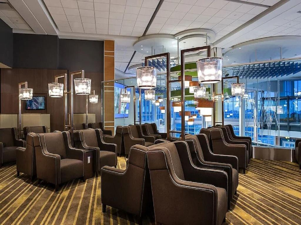 Located across from Gate E88, and overlooking the arrivals hall below, this lounge serves guests departing to the United States. With upgraded inviting seating, fixtures and lounge - space for around 132 guests, the lounge is well appointed and functional. A food and beverage counter serves a range of hot food items throughout the day, as well as a selection of hot and cold beverages, for those who would like to enjoy a drink or two at the lounge, we serve alcoholic beverages to start your vacation from the airport.